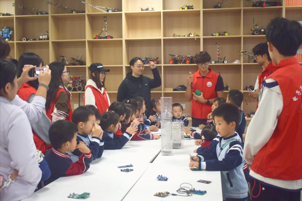 朱雀幼儿园,共同在216室创客基地开展“智慧小齿轮”主题研学活动。支部副书记孙超,科协主席王乐焱,李博祥、周颖莹、张璇、郑泽宇等志愿者,朱雀幼儿园副园长曹蛟、教师代表和大班小朋友共同参与了此次活动。