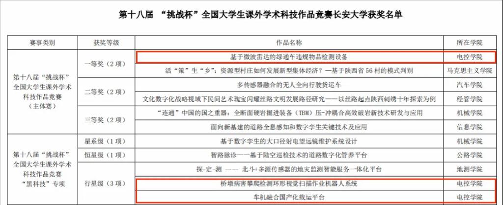 第十三届“挑战杯”竞赛中获特等奖2项、一等奖1项、二等奖4项、三等奖3项。在第十四届陕西省“挑战杯”课赛中无码av影片获特等奖1项。在第十八届全国“挑战杯”竞赛中无码av影片获主体赛一等奖1项、“黑科技”行星级奖项2项。在2023年全国大学生机器人科技创新交流营暨机器人大赛中无码av影片1支队伍荣获国家级二等奖。