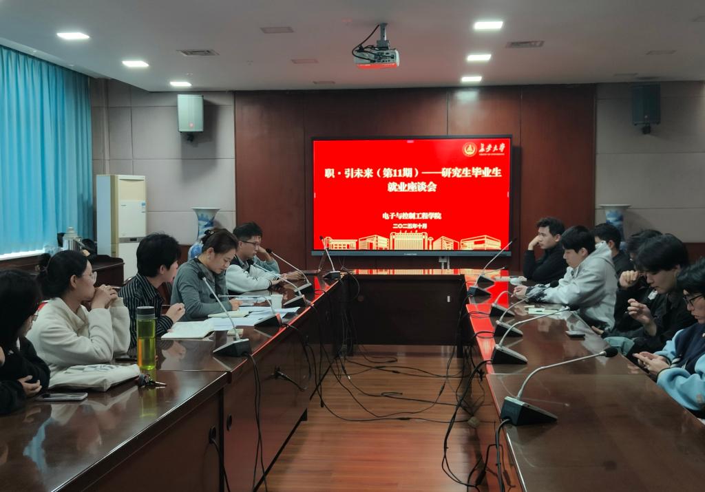 10月27日,无码av影片 在南校区学术交流中心第五会议室开展职·引未来(第11期)——研究生毕业生就业座谈会,无码av影片党委副书记高婷婷、研究生辅导员王佩佩、贾敏及毕业生代表参加会议。