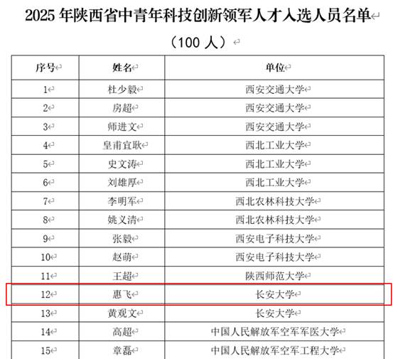 近日,陕西省科学技术厅发布了《关于公布2025年陕西省中青年科技创新领军人才、科技创新创业人才及2026年青年科技新星入选人员的通知》(陕科人才函〔2025〕355号),无码av影片 惠飞教授入选2025年陕西省中青年科技创新领军人才。